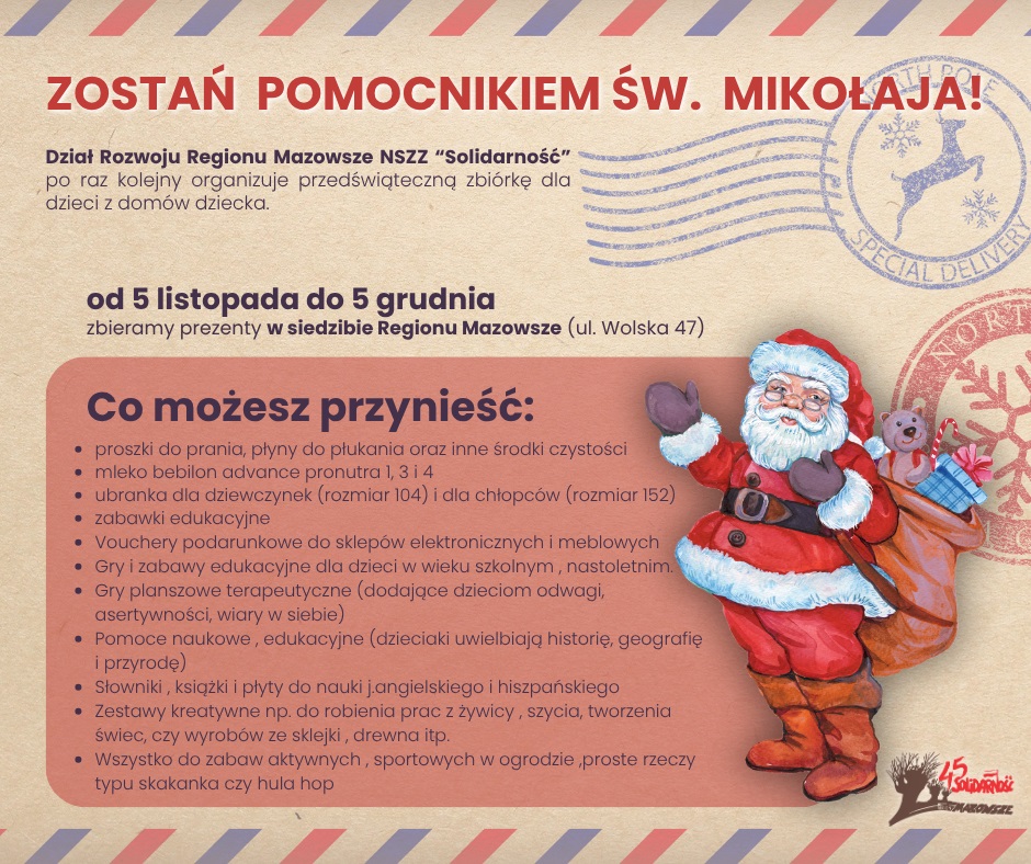 Prezenty zbieramy w siedzibie Regionu Mazowsze (ul. Wolska 47) w dniach 5 listopada - 5 grudnia.